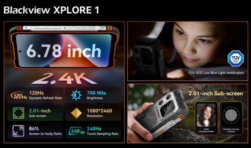 يتميز هاتف Blackview XPLORE 1 بشاشة رئيسية مقاس 6.78 بوصة بدقة عالية تبلغ 2.4K، ومعدل تحديث 120 هرتز، وسطوع 700 شمعة. كما أنه حاصل على شهادة TÜV SÜD لمقاومة الضوء الأزرق الضار، مما يحمي عينيك من الضوء الأزرق الضار.