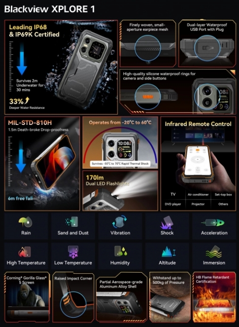الهاتف الذكي مقاوم للماء والغبار بفضل شهادة IP68/IP69K ومطابقته لمعايير MIL-STD-810H. يتحمل السقوط من ارتفاع يصل إلى 6 أمتار، وضغطًا يصل إلى 500 متر، والغمر في الماء حتى عمق مترين لمدة نصف ساعة. يعمل هاتف Blackview XPLORE 1 بسلاسة في درجات حرارة قصوى تتراوح بين -20 درجة مئوية و60 درجة مئوية.