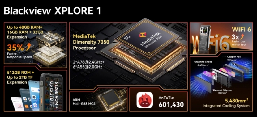 يعمل هاتف Blackview XPLORE 1 بمعالج MediaTek Dimensity 7050 بتقنية 6 نانومتر. وفي اختبار AnTuTu، حقق الهاتف ما يقارب 601,430 نقطة. ويأتي مزودًا بذاكرة وصول عشوائي (RAM) سعة 16 جيجابايت، مع إمكانية إضافة 32 جيجابايت من الذاكرة الافتراضية. أما سعة التخزين الداخلية، فهي 512 جيجابايت، قابلة للتوسيع حتى 2 تيرابايت عبر بطاقة microSD.