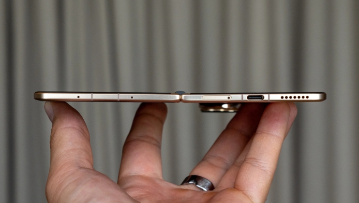 هذه هي أبعاد إصدار العاج الأبيض فقط. أما الطرز الأخرى، بما فيها إصدار الفجر الذهبي الذي اشتريته للاختبار، فكانت أكبر قليلاً. عند الطي، يبلغ سمكه 9 مم، وعند الفتح 4.2 مم. مع ذلك، يُعدّ حجمه مثيرًا للإعجاب، خاصةً بفضل وزنه (217 جم للعاجي الأبيض و222 جم للإصدارات الأخرى). هذا الوزن أقل من وزن هاتف iPhone 16 Pro Max الرائد ، إذ يبلغ وزنه 227 جم .