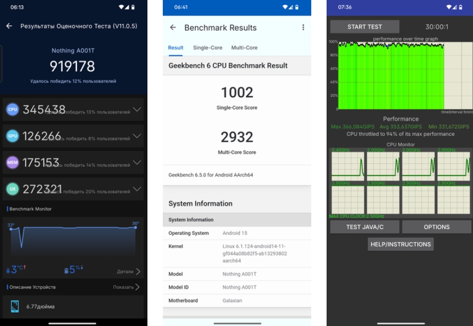 • في اختبار خفض أداء وحدة المعالجة المركزية، أظهر الجهاز انخفاضًا في الأداء بنسبة 6% فقط، مما يدل على استقرار أدائه تحت الحمل. ولم يُلاحظ أي ارتفاع في درجة الحرارة.