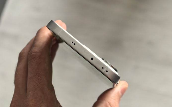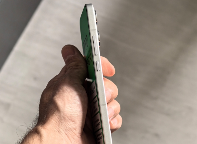 يتوفر الهاتف بلونين: عرق اللؤلؤ اللامع أو الأخضر الداكن. حملتُ كلا الهاتفين بين يدي أثناء العرض. أكثر ما أعجبني هو عدم وجود آثار بصمات الأصابع على الزجاج. كما أشيد بتوزيع الوزن وجودة التصنيع بشكل عام: يبدو الهاتف ككتلة واحدة.