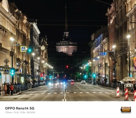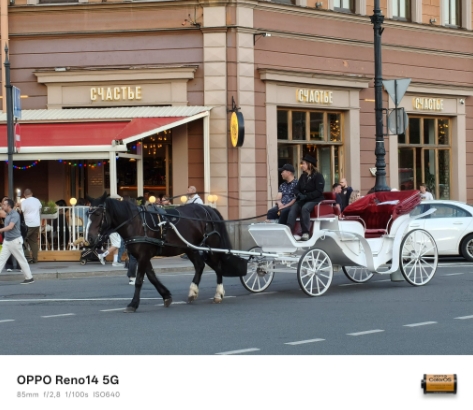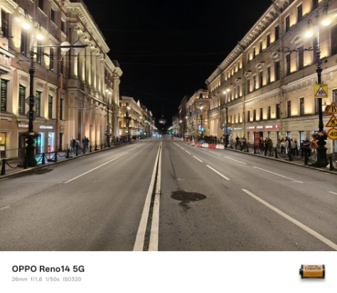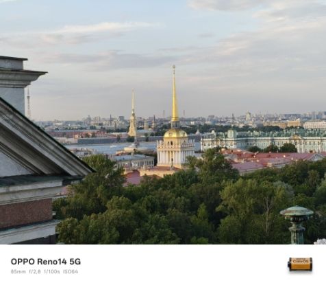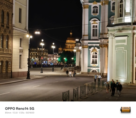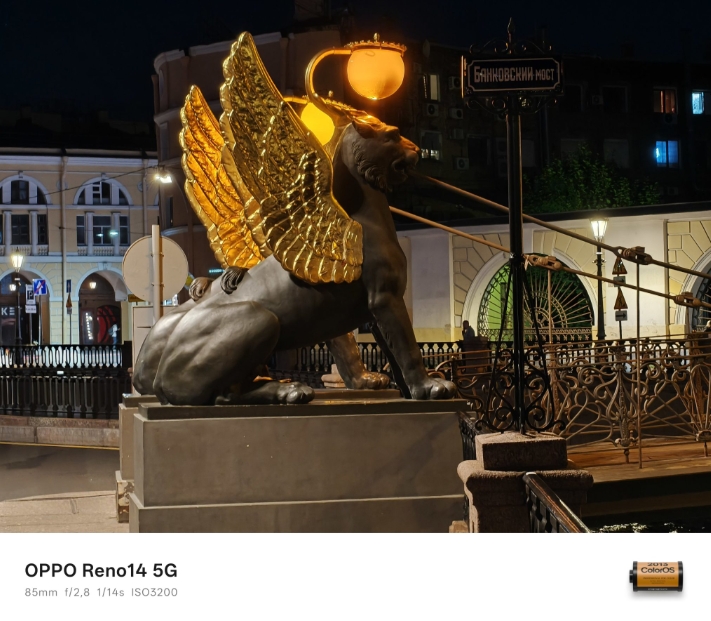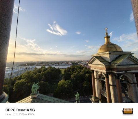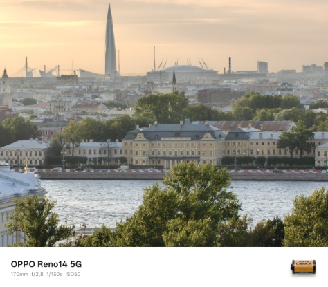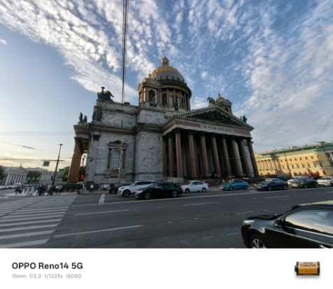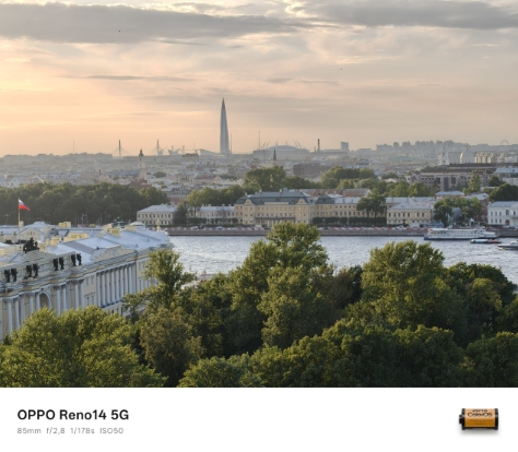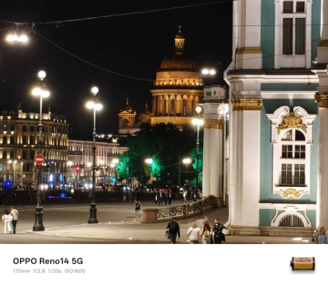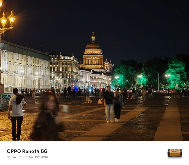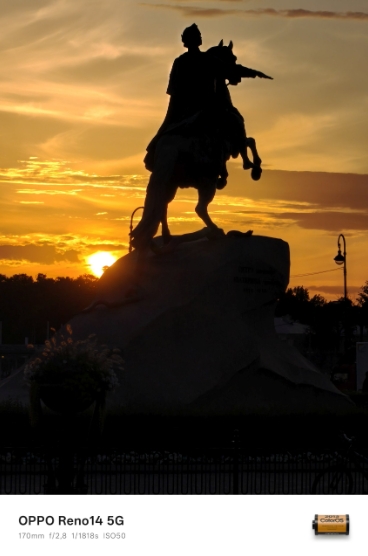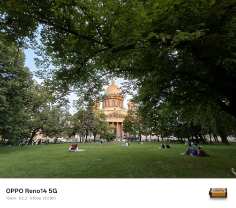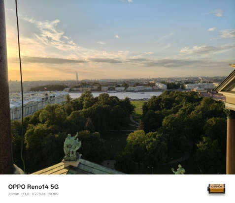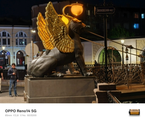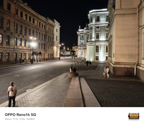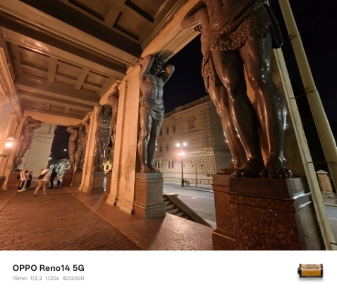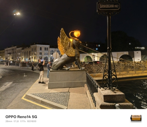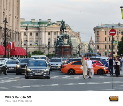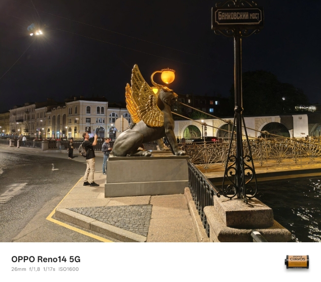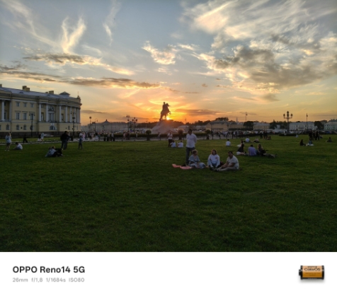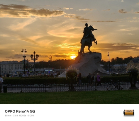 قدرات الذكاء الاصطناعي مُرضية أيضًا. على سبيل المثال، يُقدم الهاتف فلاتر سيناريوهات مُناسبة تمامًا. على سبيل المثال، كنتُ أُصوّر الفارس البرونزي أمام الشمس. والهاتف نفسه يُشبه: هل تُريد فلتر Silhouette لجعل كل شيء جميلًا؟ وأنا أُريده. أو يُمكنك إزالة أي شيء غير ضروري من الصورة، وزيادة وضوح الإطار، وتصحيح الوجه إذا رمشت. في الأيام القادمة، سنُصدر مراجعة مُنفصلة مُخصصة لقدرات الشبكات العصبية في Oppo. في غضون ذلك، إليك بعض الأمثلة. انظر كيف يتعامل الهاتف جيدًا مع إزالة الأشخاص غير الضروريين في الإطار. تعمل ميزة الحدة أيضًا بشكل جيد. انظر إلى الإطار أدناه. كان مُشوّشًا تمامًا. كان تأثير الحدة رائعًا بالنسبة لي، لكن الفتاة في الخلفية كانت في الظل قليلاً، والنتيجة ليست مثالية.