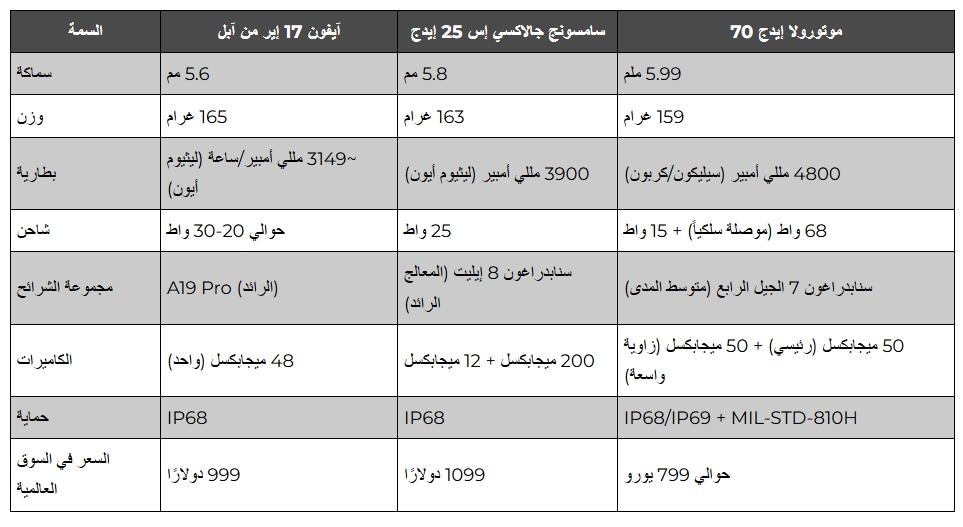 على سبيل المثال، يحتوي هاتف Motorola Edge 70 على بطارية بسعة 4800 مللي أمبير في الساعة في هيكل بسمك 5.99 ملم، بينما يحتوي هاتف Apple iPhone 17 Air بتقنية تقليدية على بطارية بسعة 3149 مللي أمبير في الساعة فقط بأبعاد مماثلة.